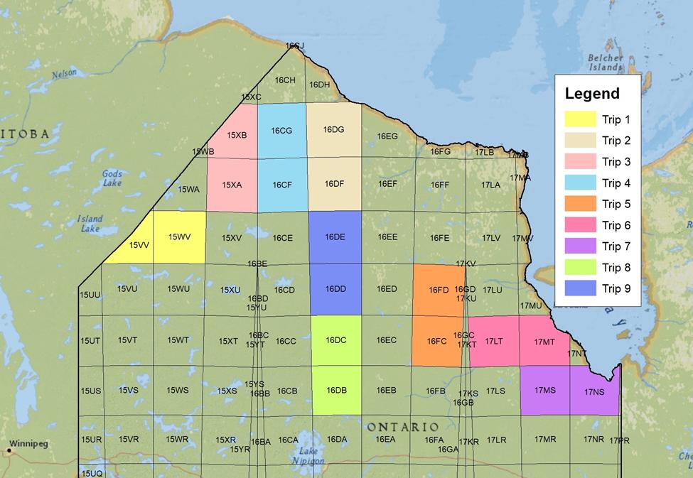 The table below and the map provided here both show nine of the trips we are hoping to run in 2022 and beyond. A more comprehensive list will be available on the Atlas-3 website later this fall. All of the 100-kilometre blocks in northern Ontario must be adequately covered by the end of 2025.